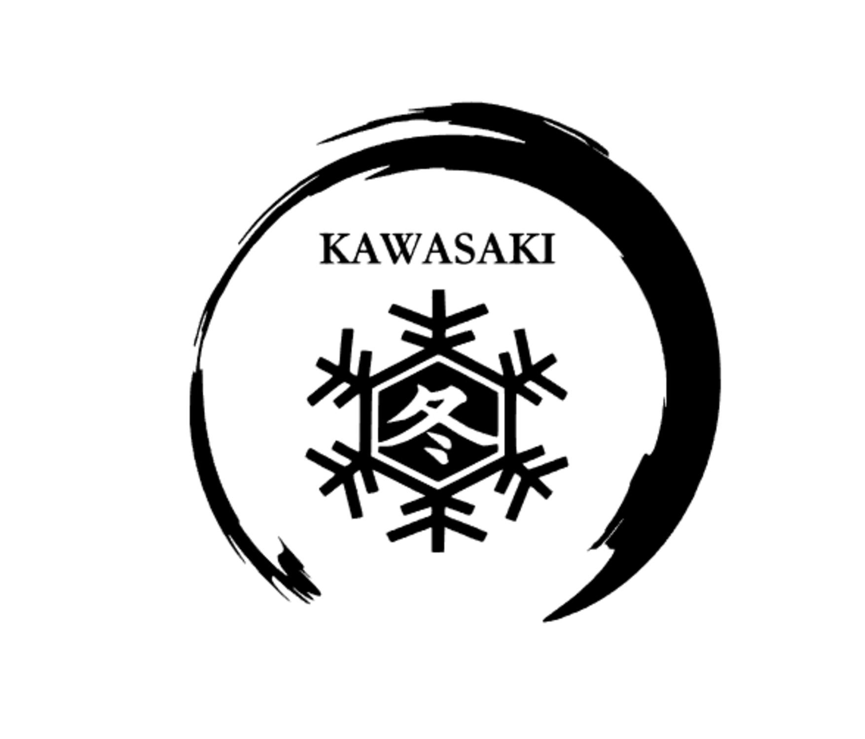1. 🌀 Diseño artístico inspirado en Japón: círculo enso (pincelada zen), copo de nieve con kanji 冬 (invierno), y texto “KAWASAKI” en tipografía clásica. Simboliza equilibrio, fuerza y estética samurái moderna.